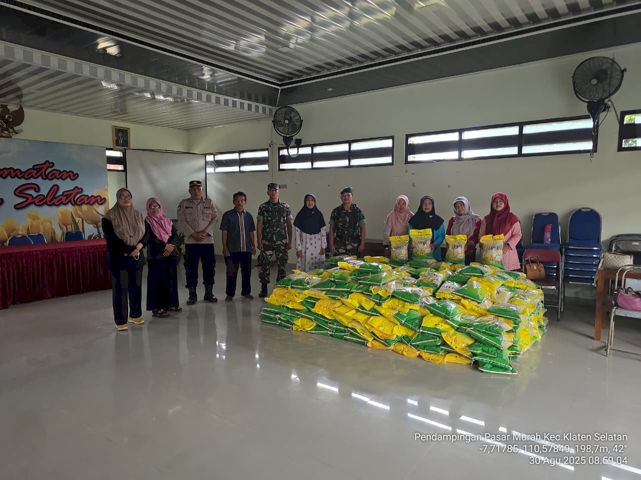 Secara simbolis, Camat Klaten Selatan, Ir. Anna Fajriah Hidayati, M.Si., menyerahkan bantuan beras kepada warga dengan harga khusus. Dalam program ini, masyarakat dapat membeli beras medium dengan harga hanya Rp 11.400 per kilogram, jauh di bawah harga pasar., yang berarti hanya perlu membayar Rp 57.000 untuk satu paketnya.
