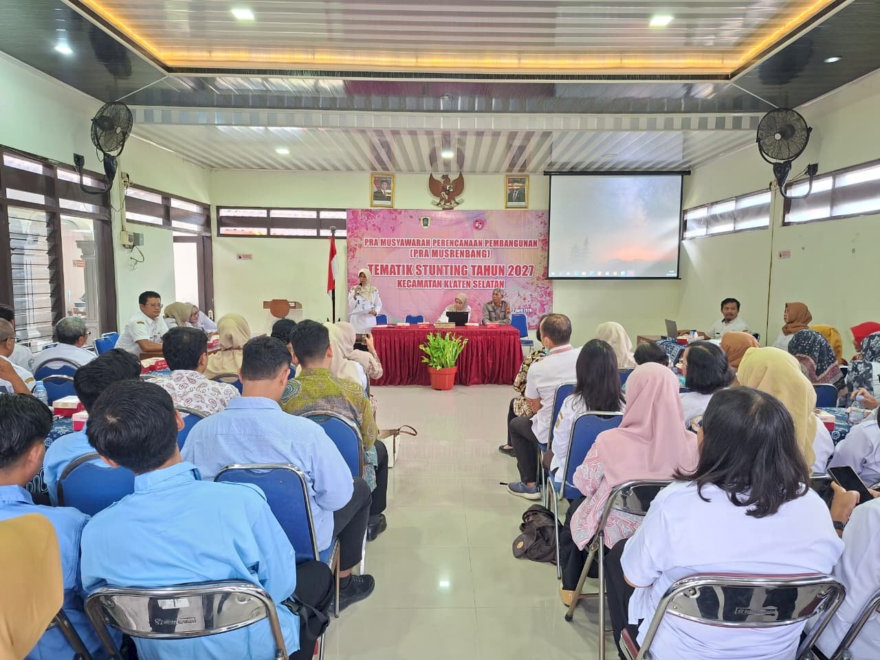 Klaten Selatan — Rabu, 22 April 2025, Aula Kecamatan Klaten Selatan menjadi lokasi pelaksanaan Pra Musyawarah Perencanaan Pembangunan (Pra Musrenbang) Tematik Stunting Tahun 2027. Kegiatan ini merupakan forum awal musyawarah untuk menyusun rencana program percepatan penurunan stunting secara terintegrasi, dengan fokus pada penyatuan data serta penguatan kolaborasi lintas sektor.